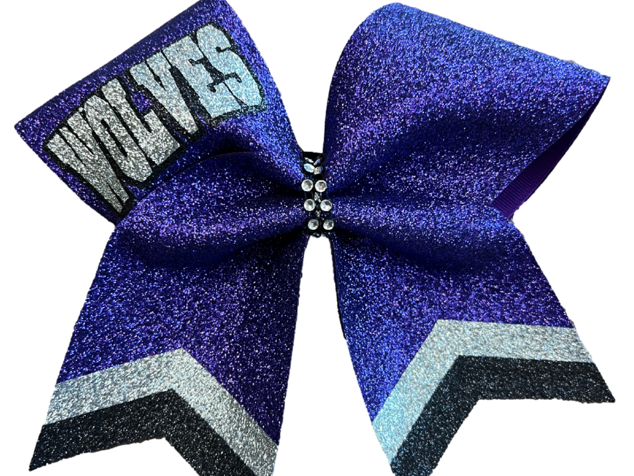The Purple Glitter Cheer Bows with Combination Tails is handmade with the finest materials for it to last all cheer season long. It is available in a variety of color combinations.