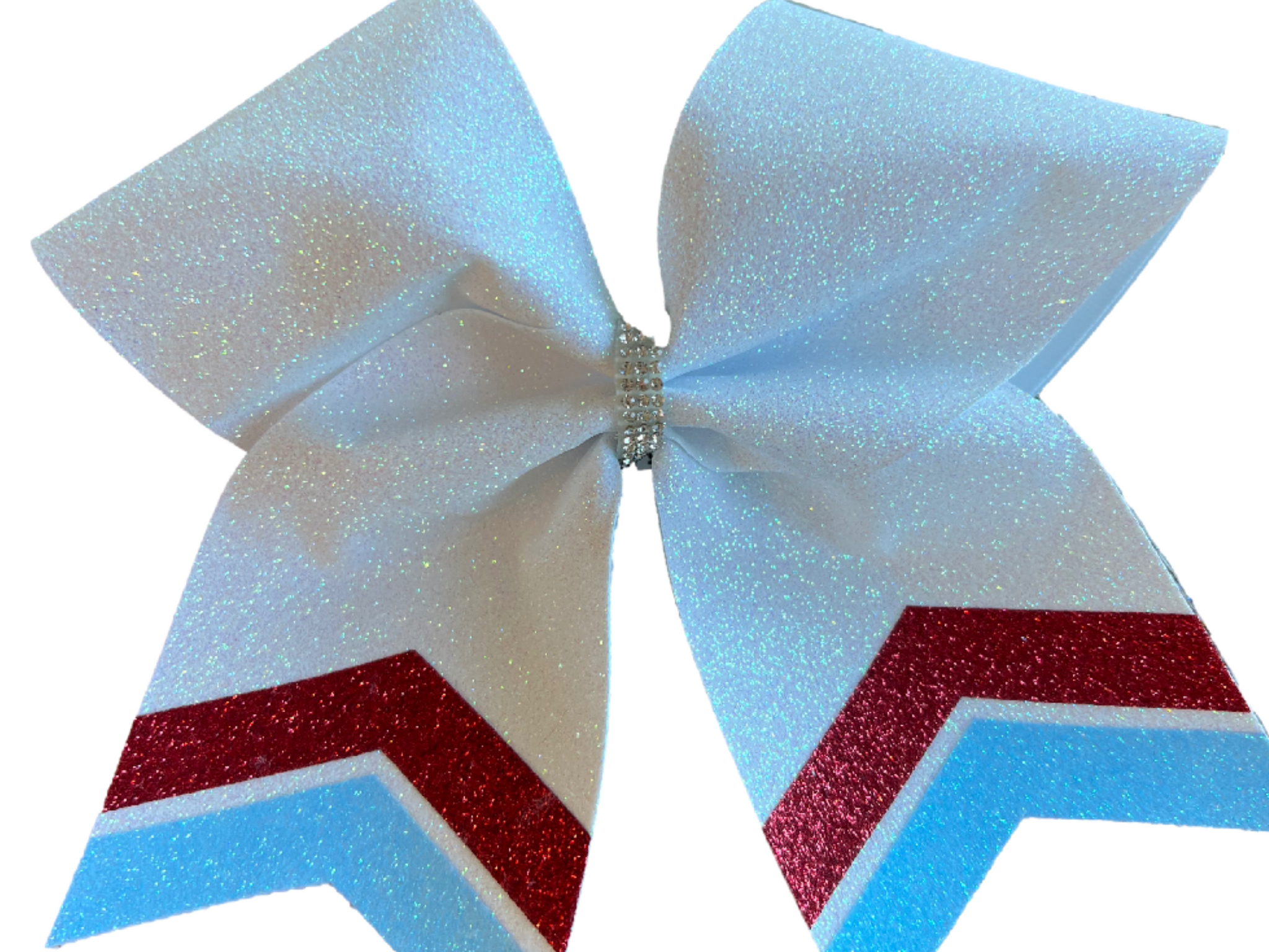 The White Glitter Cheer Bows with Combination Tails is handmade with the finest materials for it to last all cheer season long. It is available in a variety of color combinations.