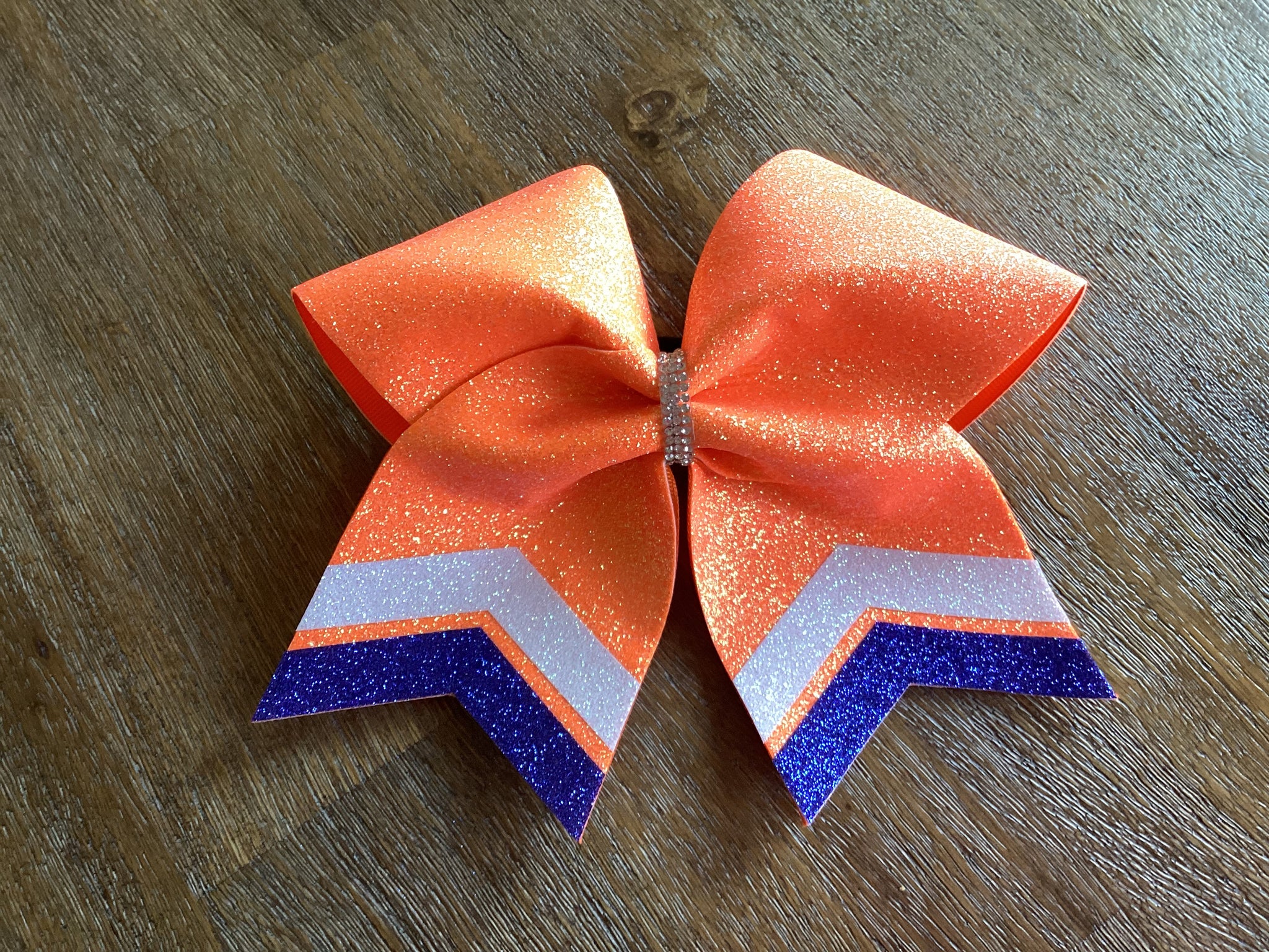The Orange Grosgrain Cheer Bows with Combination Tails is handmade with the finest materials for it to last all cheer season long. It is available in a variety of color combinations.